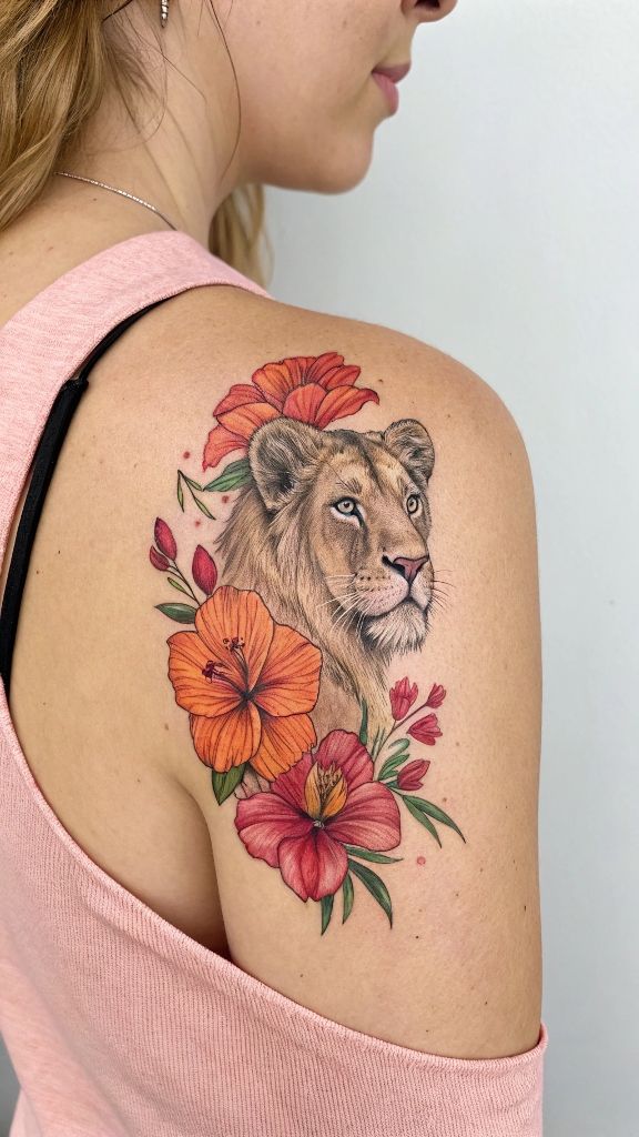 Sunlit hibiscus and a serene lioness—this is vacation energy bottled. The color work is fresh but sophisticated, so it reads as feminine rather than cute. If your closet leans neutral, this pop of coral and green becomes your forever accessory. It’s a design for women who want warmth, optimism, and a little island breeze on the shoulder. What to wear it with: off-shoulder knits, slip dresses, and gold hoops. A soft coral lipstick echoes the floral palette without competing. For longevity, request a traditional color pack with smooth blends; bright pigments on the upper arm age well when you’re diligent with SPF.