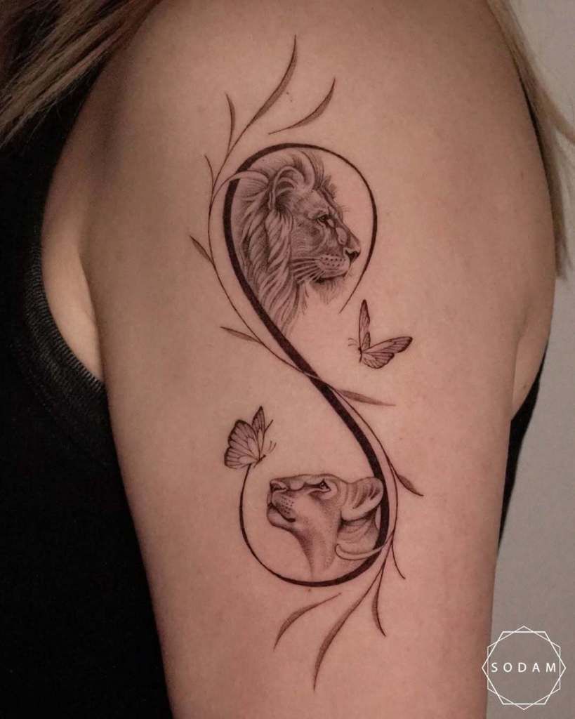 An elegant loop frames the pair—mane and sleek muzzle—surrounded by airy leaves and drifting butterflies. The figure-eight line suggests continuity, growth, and partnership without spelling anything out. It’s romantic but not saccharine, an elevated design for women who love symbolism served chic. The vibe or attitude it gives off: serene authority with a hint of play. Place it high on the arm Women to echo the natural curve of the deltoid. Keep lines The fine line and the butterflies are light, so the infinity stroke remains the star; compared with Mandala density, this stays breezy and modern.