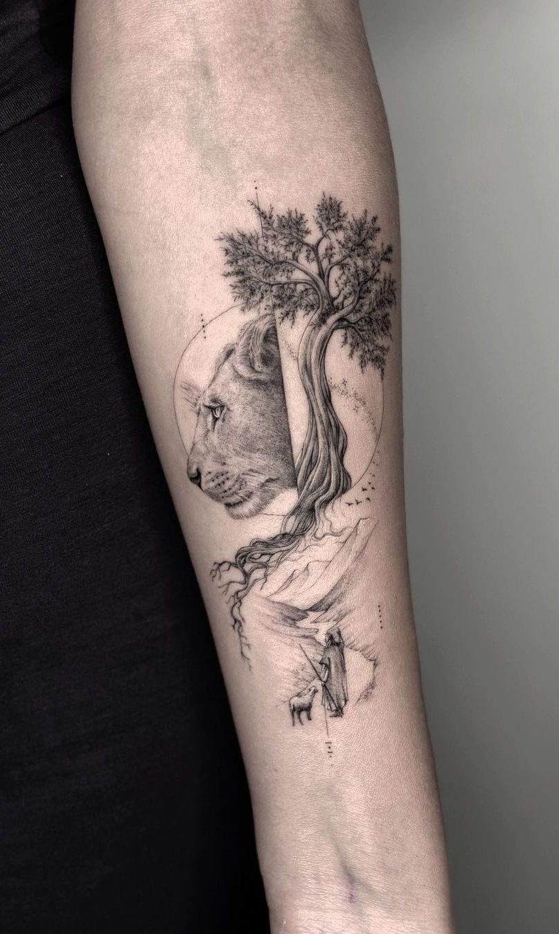 A lioness emerges from a wind-bent tree, like memory and instinct braided together. The scene feels cinematic—tiny birds, distant paths, a quiet horizon—yet the portrait remains the anchor. It’s the sort of design for women who’ve weathered seasons and come out wiser, not harder. The circular halo and drifting roots give the piece movement without noise, a minimalist narrative that still carries women’s strength you can feel. Who it’s for: if you love Fine Line storytelling and want a piece that reads like a talisman on the daily commute, go forearm. This placement works for women’s arm visibility while staying elegant with blouses and bracelets. Choose Fineline dotwork to keep the tree airy, and ask your artist to space the micro elements so healing stays clean. Compared with a dense arm sleeve, you’ll get breathing room and a calmer read.