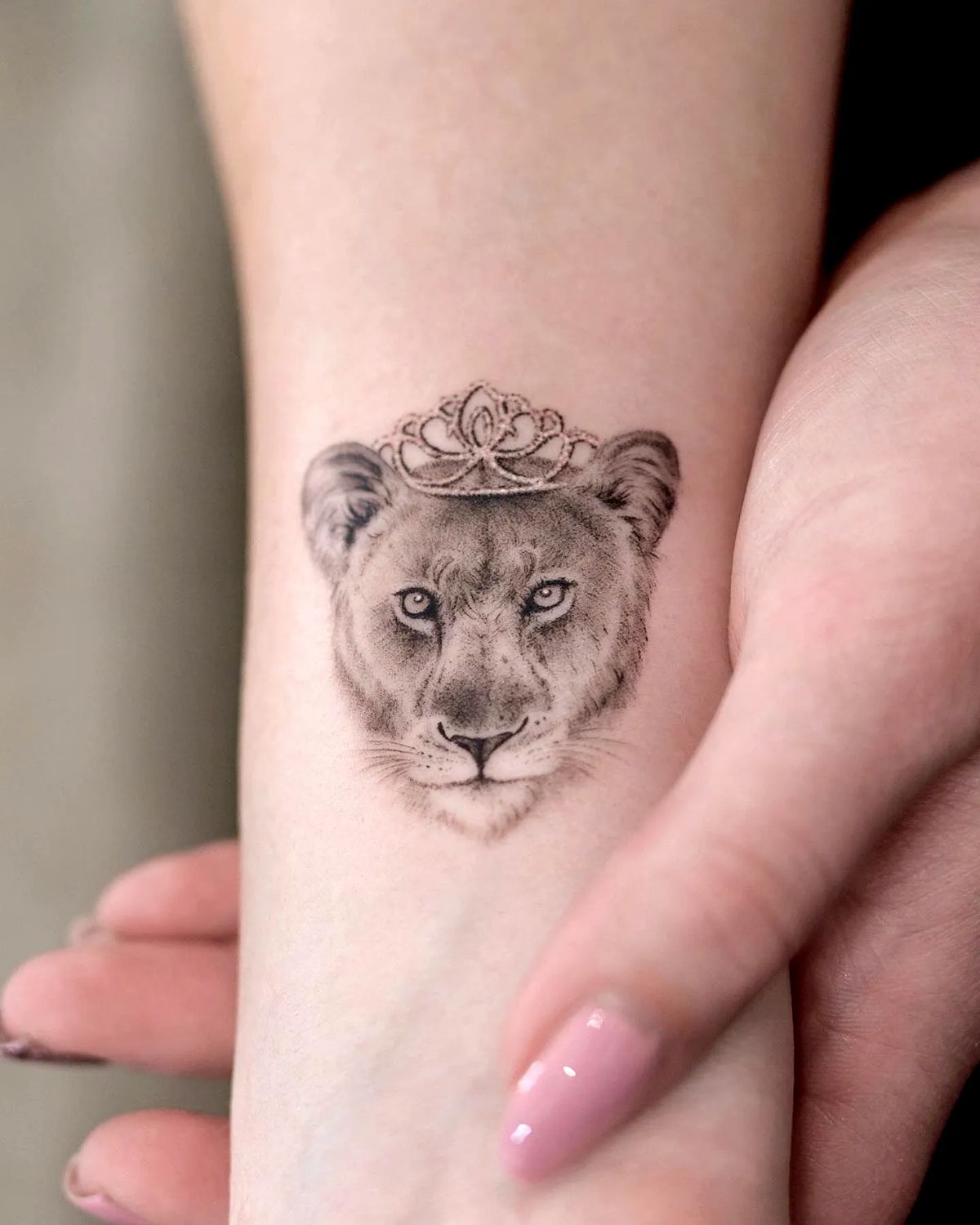 She’s not roaring—she doesn’t need to. A delicate tiara perches above steady eyes, giving you queen energy in a whisper. It’s feminine, restrained, and perfect if you want power in a compact, everyday spot. The wrist placement makes it a private oath: grace first, then steel. Minimal shading keeps the mood modern and wonderfully designed for women. What makes this special: the contrast of regal detail with a calm expression. Rather than Women Roaring drama, the tiara reads like a wink to your inner monarch. Compared with traditional bold lines, fine-line grain lets the fur texture breathe and keeps the crown airy, so jewelry stacks won’t overwhelm it.