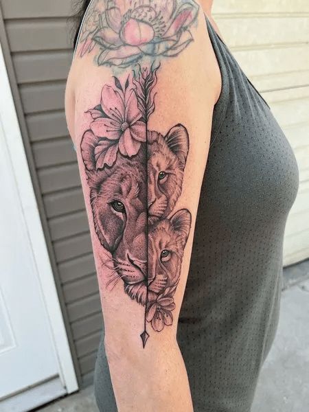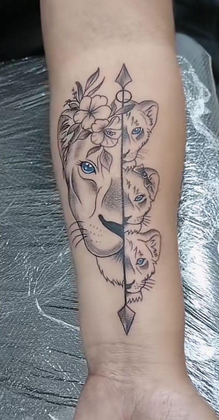 This vertical motif reads like a talisman—an arrow splitting the composition while Mother and Little Shadow nestle together. It’s a woman-with-cubs story, intimate and protective, but still sleek enough for the office. The blooms soften the edges, keeping the energy feminine and modern. Current trends: Vertical layouts on women’s arm placements are everywhere because they elongate the limb and stack neatly with bracelets or a watch. Ask for simple shading with a fine-line outline so the arrow stays crisp. If you’re torn between women’s half sleeves and a single totem, this narrow column is a smart middle ground.