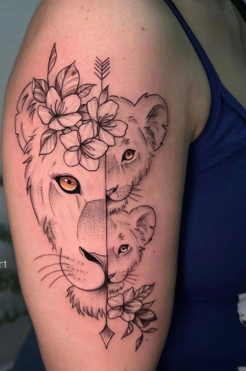 It’s striking from across the room yet still tender up close—women with cubs symbolize something that feels timeless. The eyes hold warmth, not menace, making it a welcoming statement on sunlit shoulders.