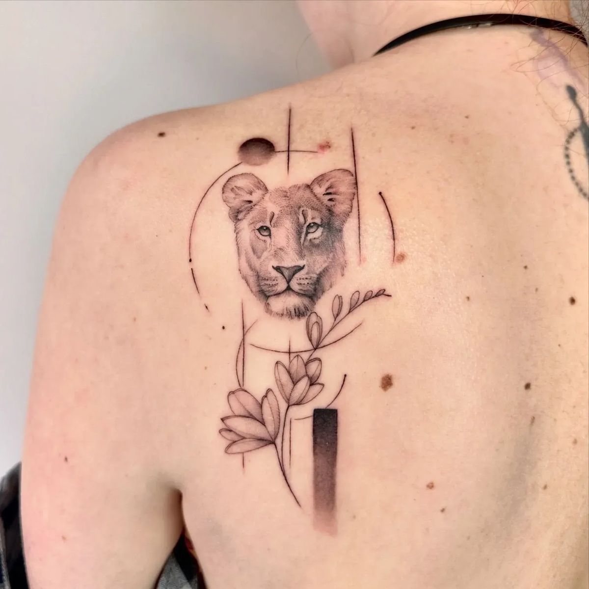 4. Fine-Line Lioness with Abstract Botanicals (Upper Back)