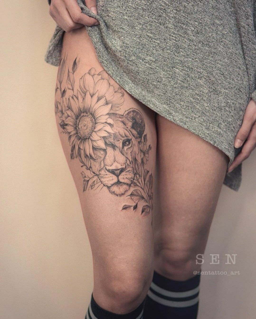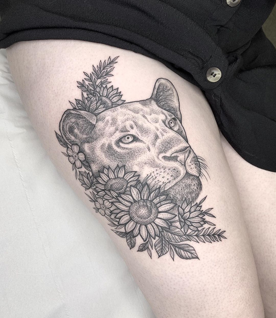 2. Moonlit Lioness with Florals Thigh Tattoo