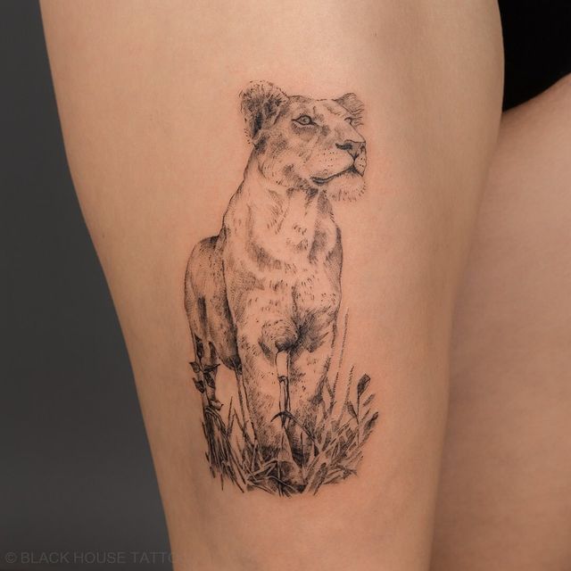 Standing tall above grasses, this sketchy lioness feels like a page torn from a travel journal—adventurous yet refined. The dotwork gives her coat texture, while the posture says “protector,” “planner,” and “provider.” It’s quietly cinematic, the kind of piece that reads like a personal legend rather than a logo. Styling tips or care: ask your artist for fine-line outlines with soft stippling in the shadows so the grasses stay light and feminine. Moisturize daily and keep SPF handy—women’s thighs get plenty of sun in summer. Pair with simple monochrome outfits, or add a strip of flowers later to widen the scene without crowding it.