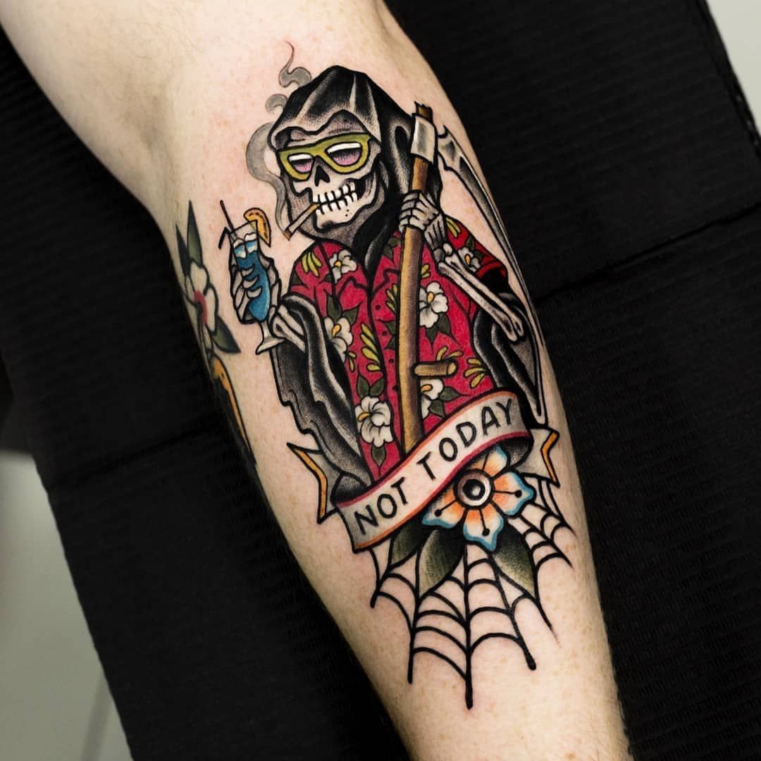 This tattoo is pure cheeky fun—the Grim Reaper in sunglasses and a floral shirt, sipping a drink with a “not today” banner. It’s bold, playful, and has that rebellious flash charm that old-school tattoos do best. It’s the kind of piece that instantly sparks conversation.