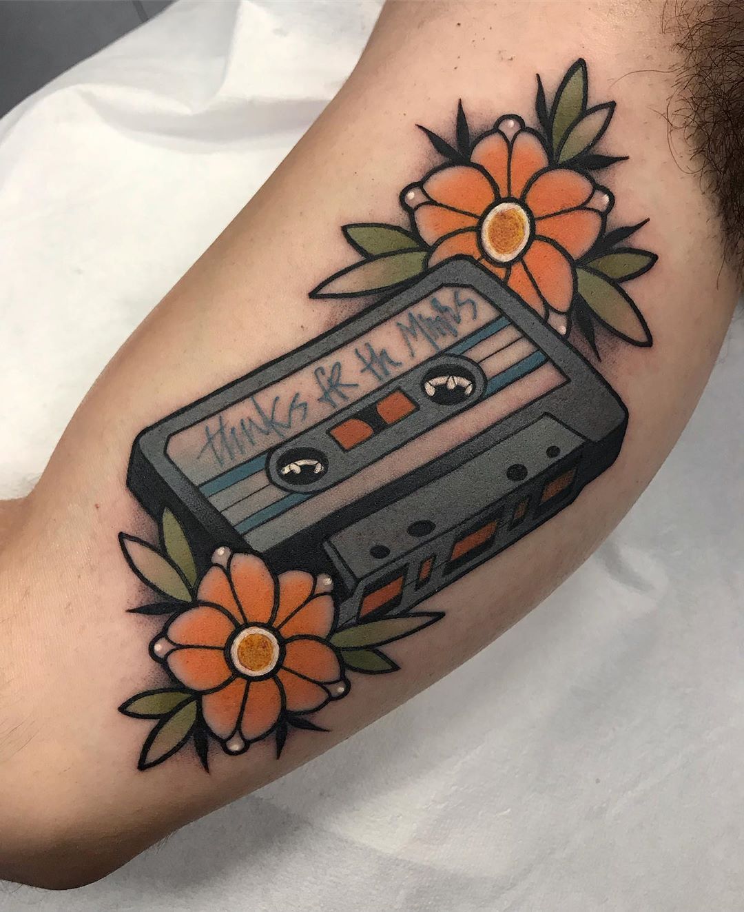 This nostalgic cassette sits like a love note to the past—warm, playful, and full of personality. The flowers around it soften the sharp lines, turning something mechanical into something sweetly sentimental. It’s the kind of tattoo that makes you smile because it instantly pulls you back into old memories, road trips, or those “forever favorite” songs.