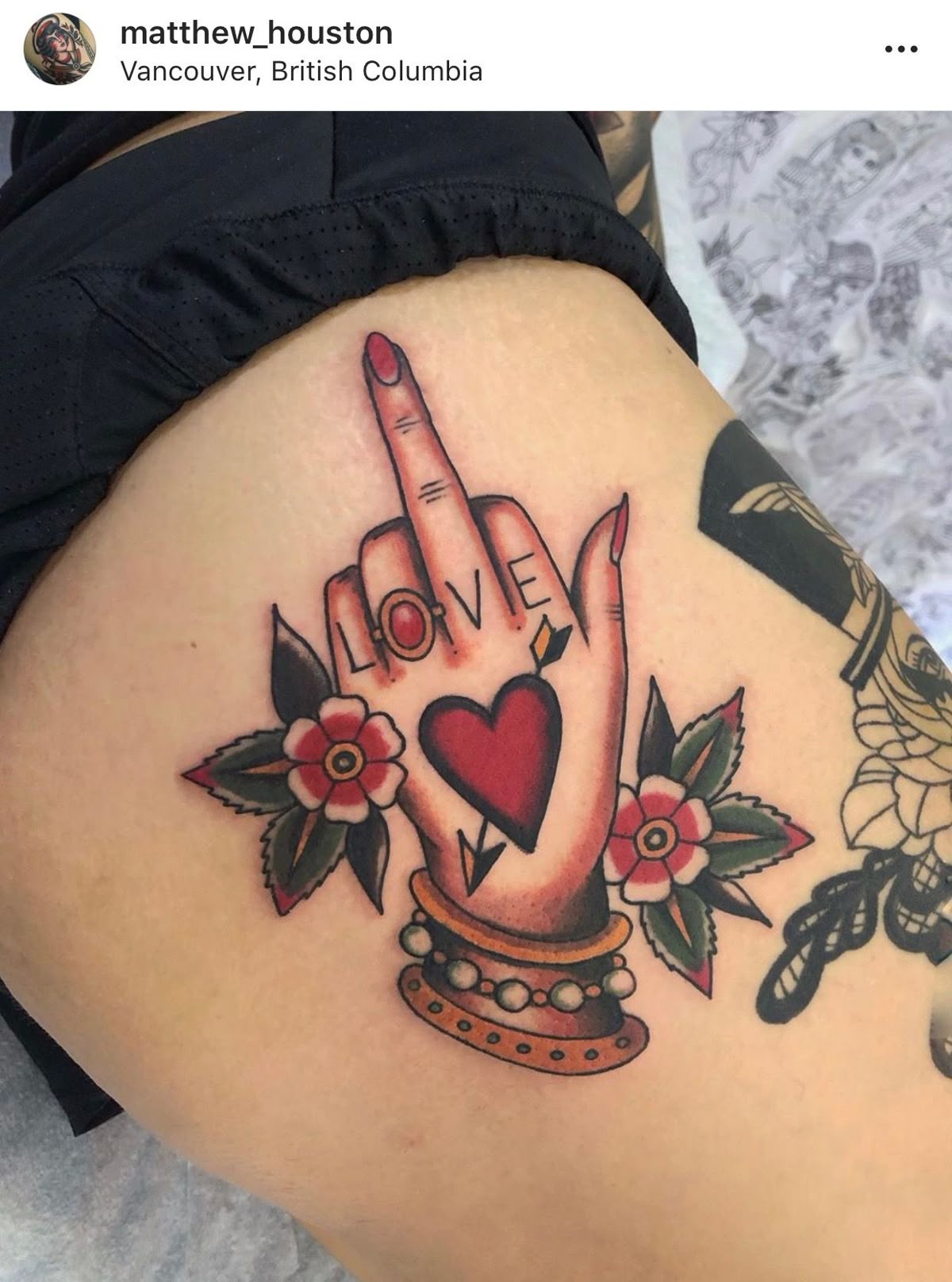 This tattoo is cheeky, bold, and delightfully rebellious—in the most stylish way possible. The hand gesture paired with floral accents and a bright heart gives it that punchy old-school energy that refuses to blend in. It’s playful but still beautifully designed, mixing humor with classic tattoo aesthetics.