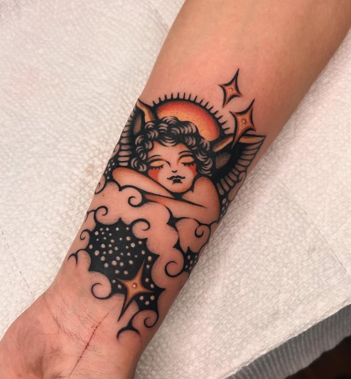 There’s such a joyful warmth to this sun-and-floral sleeve—bright, bold, and full of personality. Between the sun’s serene face and the beautiful mix of leaves, flowers, and butterflies, it feels like a celebration of nature wrapped around the arm. It’s soft and feminine yet still firmly rooted in old-school aesthetics.