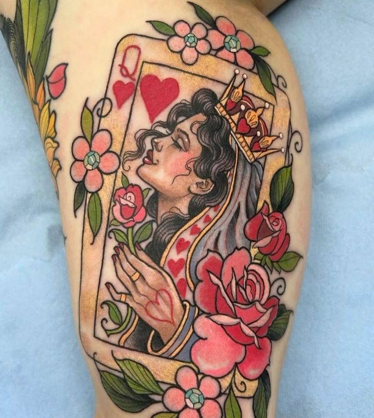 This tattoo shines on larger areas like the thigh, where it gets room to breathe. If you love ornate designs and colorful details, this composition gives you everything at once—florals, symbolism, and intricate linework. It also pairs beautifully with simpler traditional designs nearby, balancing complexity with cohesion.