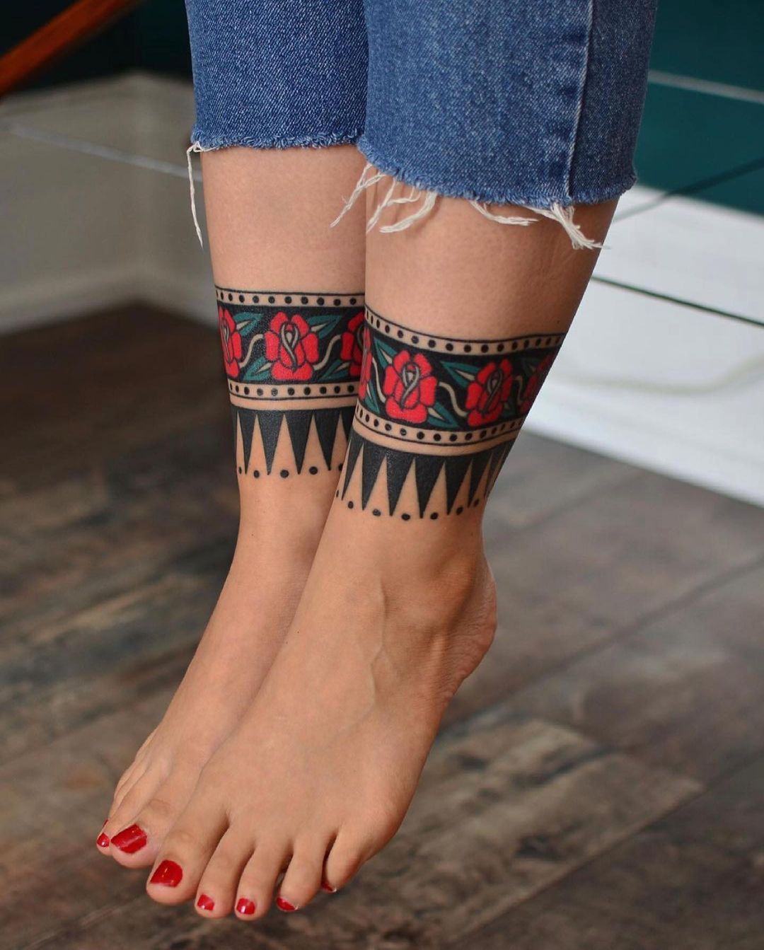 These ankle bands are a gorgeous blend of classic florals and bold geometric shapes. The repeating roses feel romantic and soft, while the triangular black pattern adds strength and grounding. Together, they create this striking balance of elegance and edge—like wearing permanent jewelry that tells its own story. There’s a lovely symmetry to the design that makes your legs look long and polished.