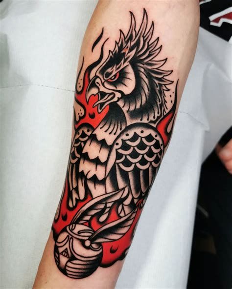 This stunning phoenix bursts with fiery energy, captured in bold lines and deep shading that feel unmistakably traditional. The powerful beak, layered feathers, and intense expression give it a fierce, unstoppable presence. It’s the kind of tattoo that almost vibrates with motion, like the flames are lifting the bird right off your skin. Perfect for anyone who loves symbolic art that still feels grounded in classic design.