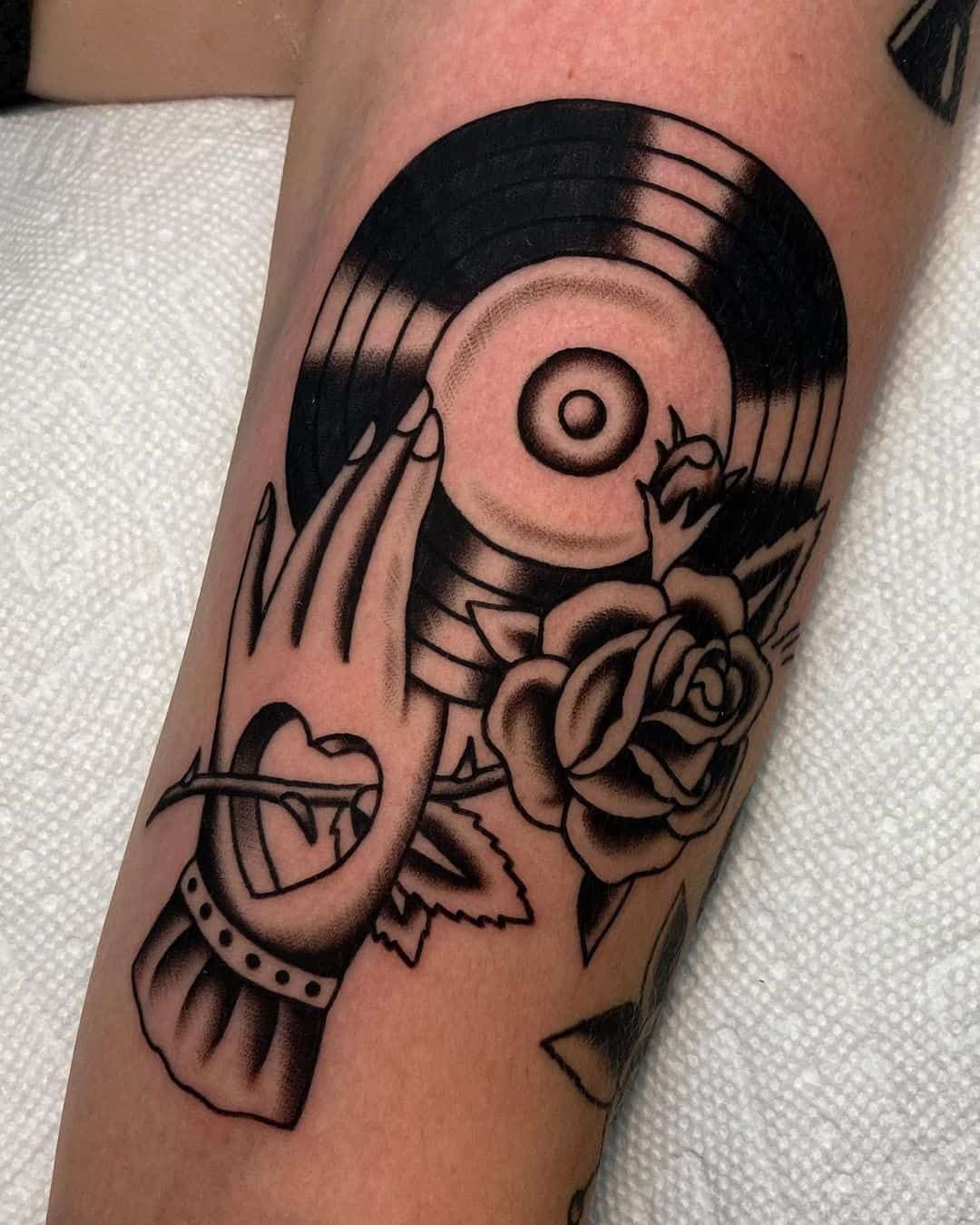 There’s a gorgeous rhythm to this record-and-hand tattoo, almost like you can hear the soft crackle of old vinyl spinning in the background. The deep black shading gives it a moody, stylish edge, while the rose keeps it grounded in that beloved vintage aesthetic. It’s nostalgic without being overly sweet—just cool, bold, and confident in its old-school roots.