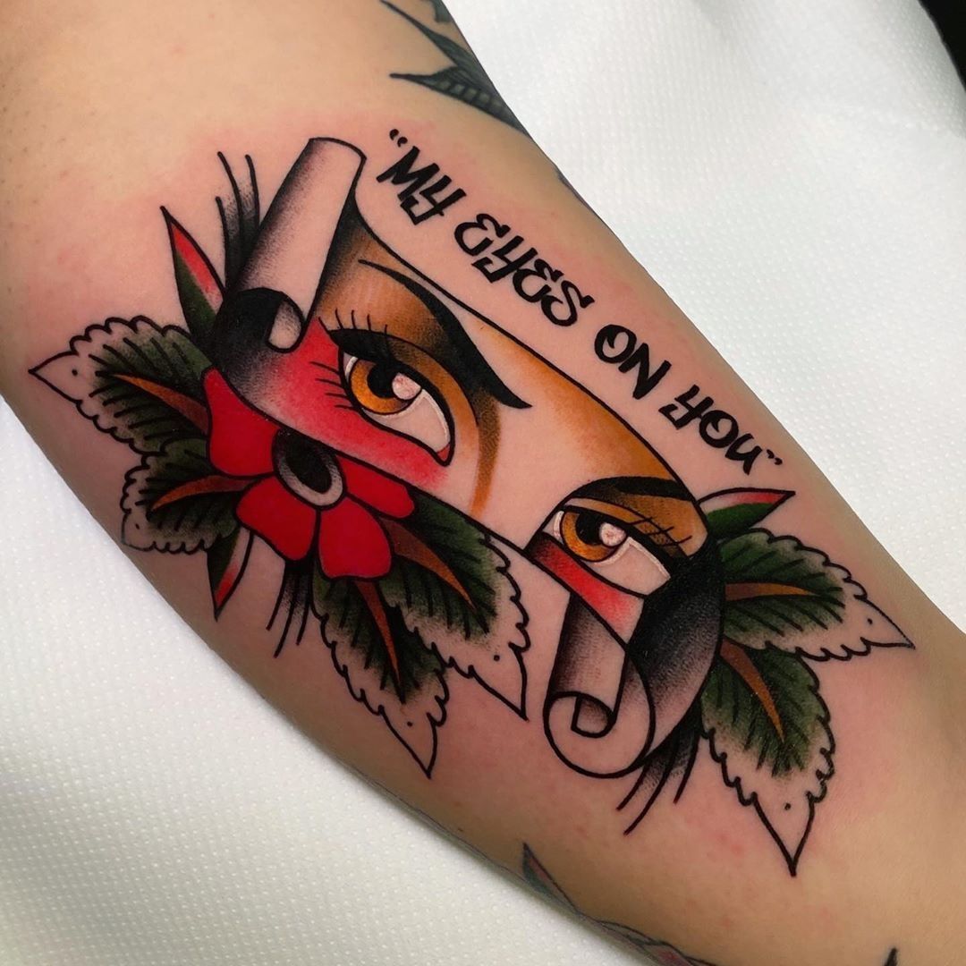 This dramatic pair of eyes peeking out from behind a scroll feels mysterious, romantic, and just a little mischievous. The blending of red tones and lush leaves gives it a passionate vibe without losing that grounded traditional feel. It’s the kind of tattoo that makes you wonder what story those eyes belong to—and that’s exactly why it’s so captivating.