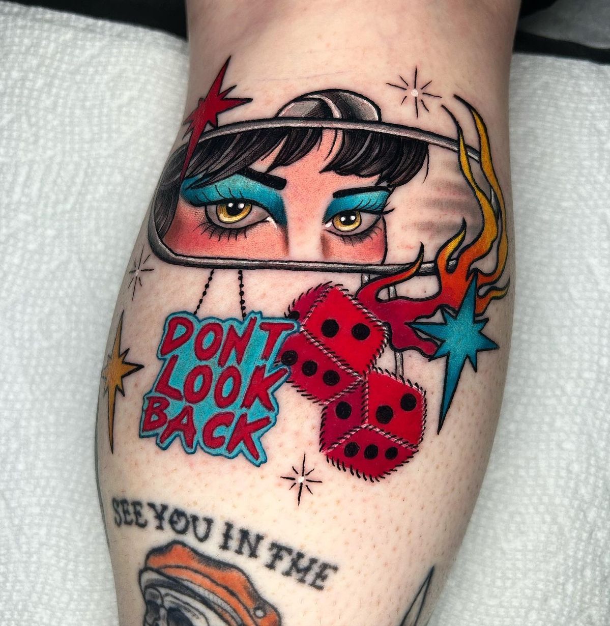 This design has such a lively, mischievous spark—those bold eyes peeking through the rearview mirror feel like they’re urging you forward with a wink and a dare. The bright makeup, flaming dice, and punchy lettering all come together with that loud-and-proud traditional attitude. It feels youthful but not childish, bold but still stylish, like a reminder that confidence often starts with looking ahead, not behind.