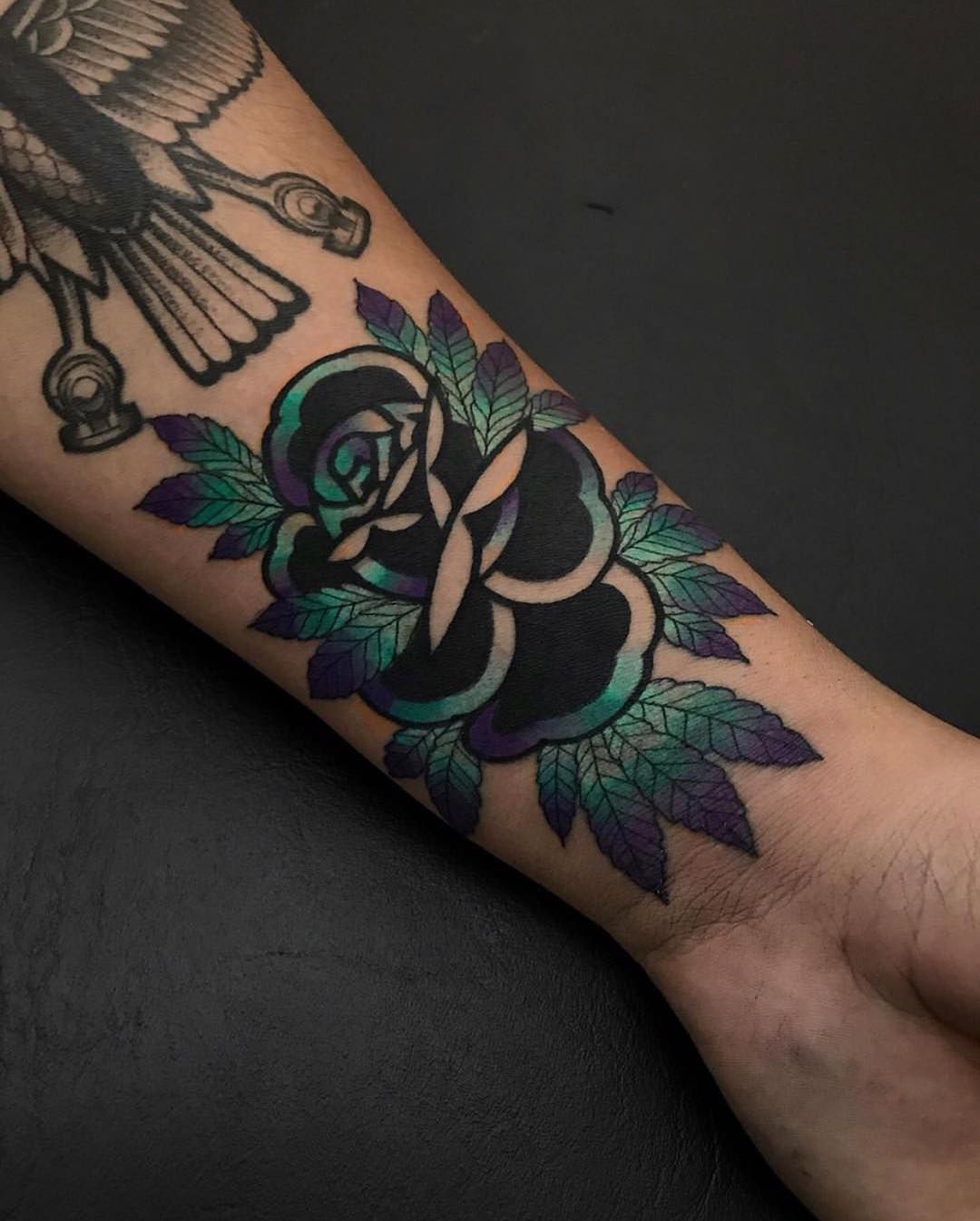 This rose feels like a twist on the classic—deep black shading contrasted with jewel-toned teal and purple petals. It’s moody, modern, and still unmistakably rooted in old-school design. There’s something almost mysterious about it, like a secret kept close to the skin.