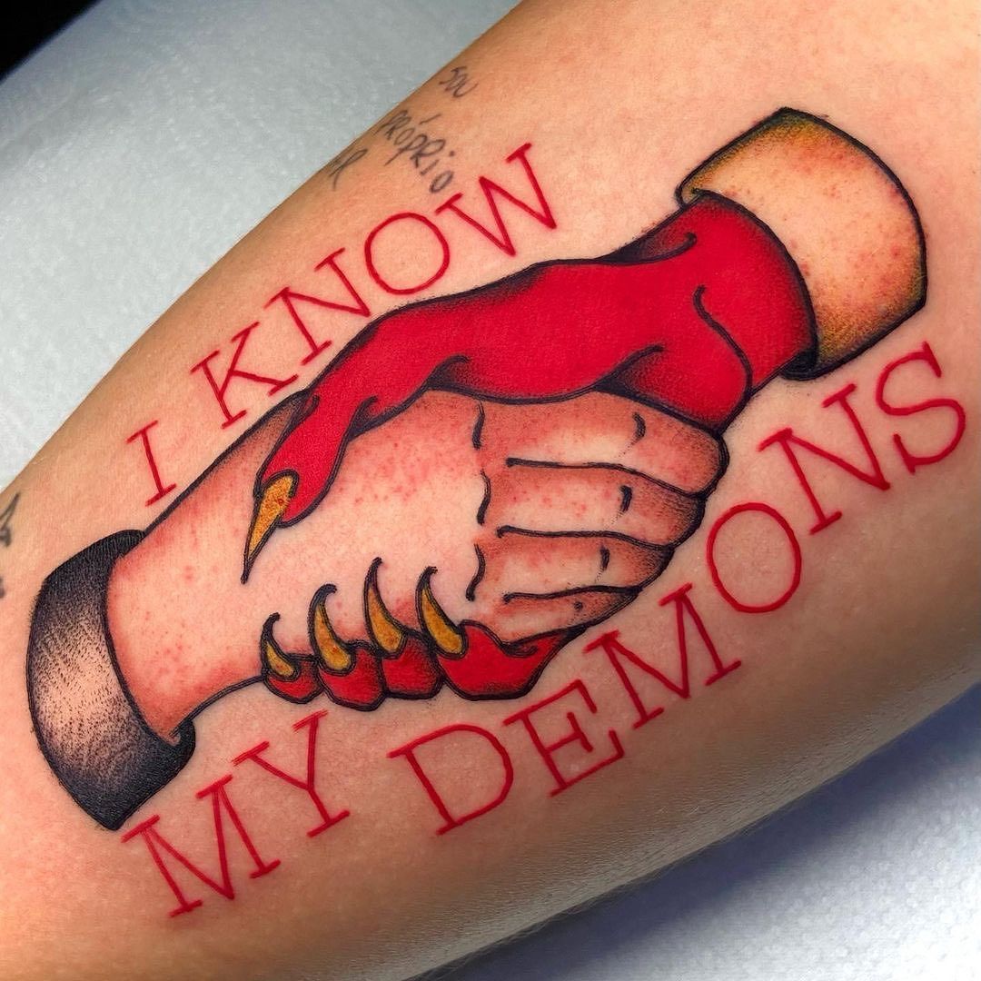 This bold handshake feels like an honest nod to personal growth—the kind of tattoo that says you’ve met your inner challenges and decided to make peace with them. The fiery red tones and sharp claws contrast beautifully against the softer shading of the human hand, creating a powerful balance between danger and strength. It’s dramatic in the best possible way, with lettering that reads like a statement of empowerment.