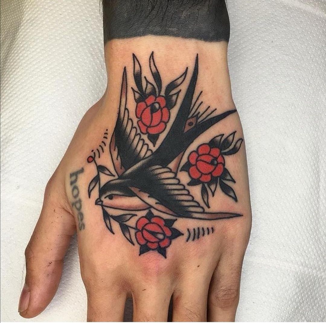There’s a sweet sense of movement in this swallow tattoo—it feels like freedom caught mid-flight. The deep black wings contrasted with bright red roses bring that classic old-school energy that never feels outdated. It’s elegant but still bold enough to stand out on the hand, the perfect mix of toughness and charm.