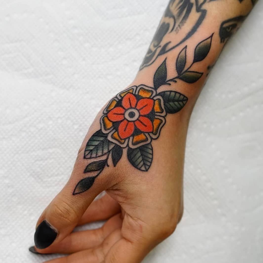 There’s something undeniably striking about a flower placed right on the hand—front and center, unapologetic. This classic bloom has clean lines, rich color, and that simple elegance old-school tattoos do best. It adds just enough attitude while still feeling polished and feminine. The design looks like it’s blooming right from your skin, giving your hand a touch of softness and strength all at once.