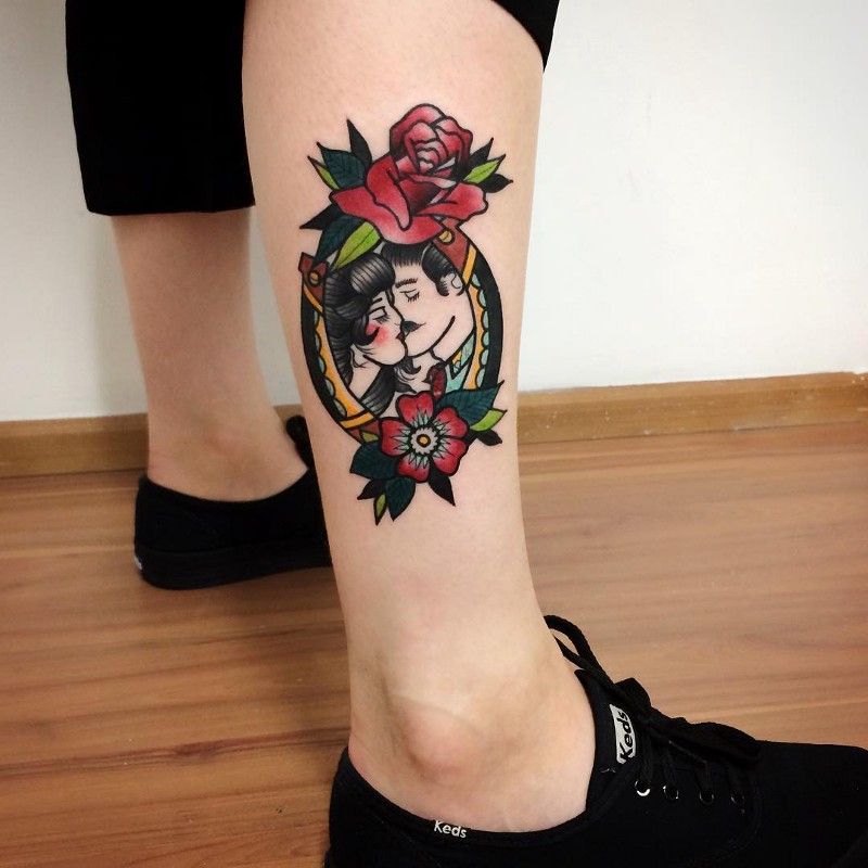 If you’re drawn to tattoos with emotional weight, this one shines on the calf or upper arm, where it gets the space it deserves. The oval frame flatters curvier areas, while the flowers help the tattoo flow naturally along the leg. It pairs beautifully with other vintage designs if you’re building a cohesive collection.