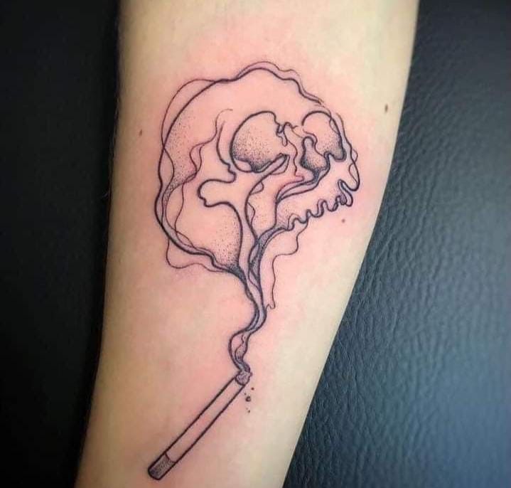 This design is quite quirky and has an interesting twist, as it incorporates cigarette smoke that climbs up and creates a skull design—it is quirky, slightly morbid, and most assuredly conversation material. Because it is a line design with some dot details, this tattoo will heal quickly and retain its edges as long as it is protected from sunlight. Additionally, this is perfect for a forearm or extended arm, having enough space for the design, meaning all of it is viewable. Moreover, text can be written below, and it will still be harmonious.