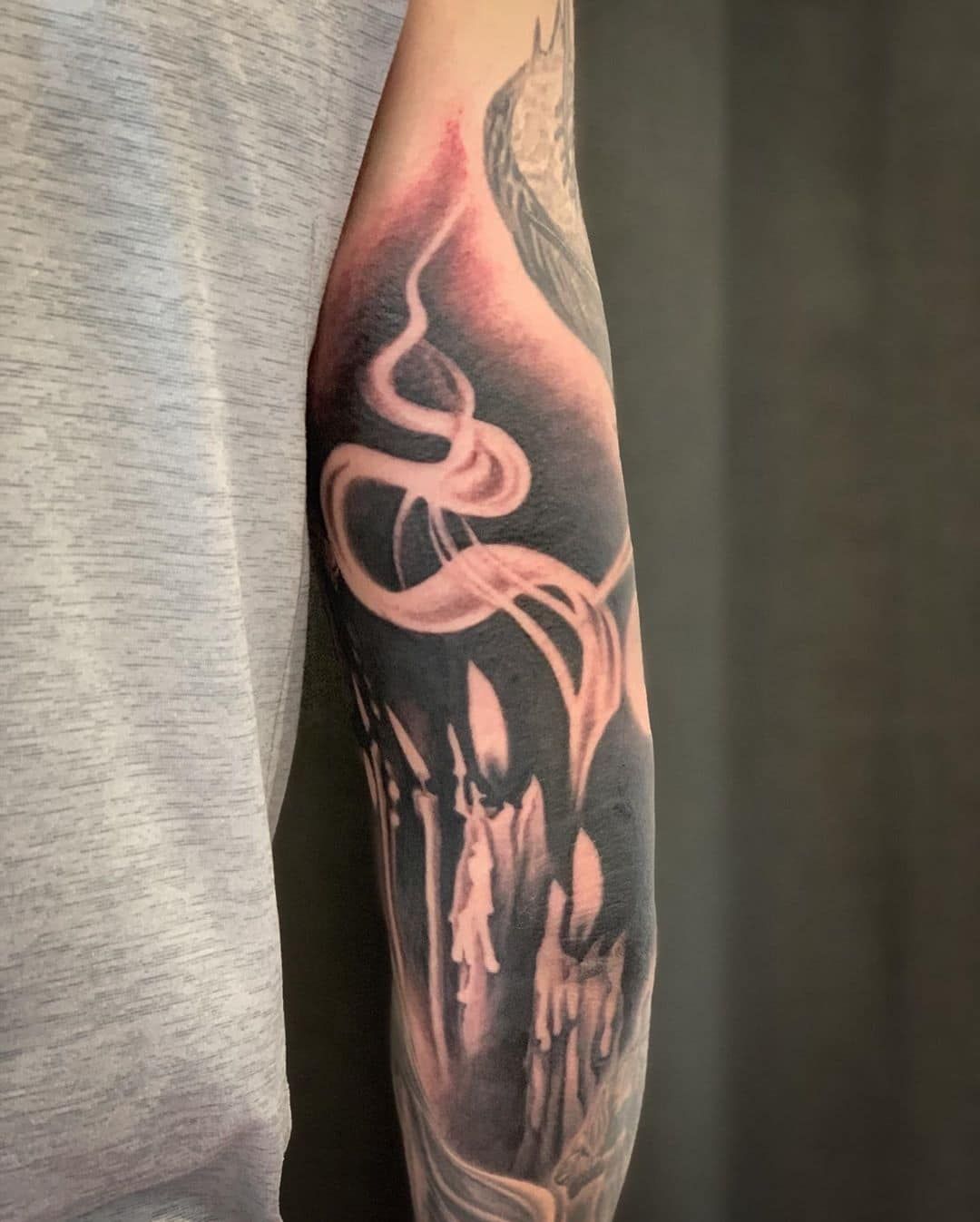 If you’re getting a larger sleeve, this is a perfect anchor because it combines elements (candles) and motion (smoke). Just be sure that you get a soft edge around your fade, so that it flows into the remainder of your arm artfully. Take care of it easily—dark ink healed with tonic is a painful recovery. You can later incorporate text, a moth, or additional smoke elements around this design, and it will all just blend together nicely.