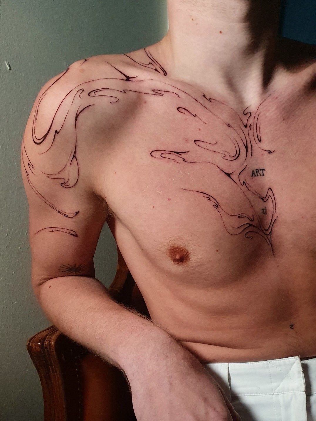 Position it so that it follows your collarbone—that way, it’ll be deliberate on strapless dresses or tops, or blazers, and V-necks. Because it’s a lining design, recovery is easy—just don’t rub it too much until it heals. You can then continue it down your arm or on the other side of your body, and it’ll still be one cohesive artistic statement.