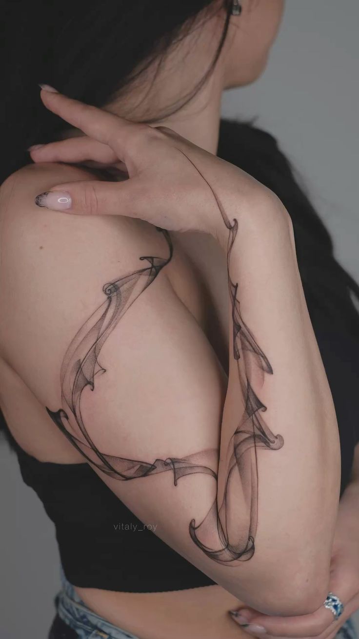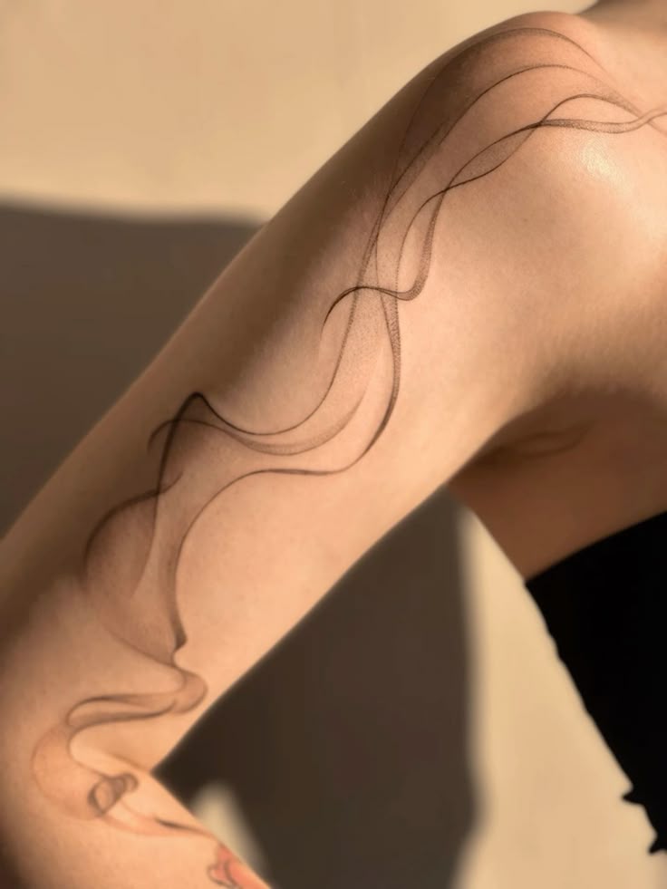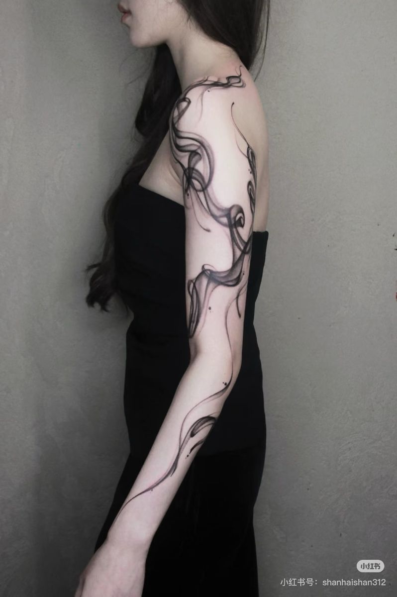 Ah, and then this one is more of a ‘dramatic’ take on a ‘smoke’ body art, as it has very ‘whimsical’ and ‘flowing’ details that extend all the way from the ‘shoulders’ down towards ‘wrists,’ as if it is musical ‘notation’ on human skin and ‘bands’ or ‘jewelry’ on one’s ‘bared’ ‘arms’ and ‘strapless’ ‘dress’—which is ‘way’ ‘rationally’ ‘optics,’ of course. It would be great if you like longer silhouettes and want a tattoo that hugs your body rather than sectioning it. You can ask your artist to incorporate it into your natural arm rotation, as if the smoke is moving as you move. Since it is all detailing, moisturizer and sunscreen can help keep this skin-like and light for a number of years, especially on women who like black or basic clothing—this gives them their ‘art’ fix.