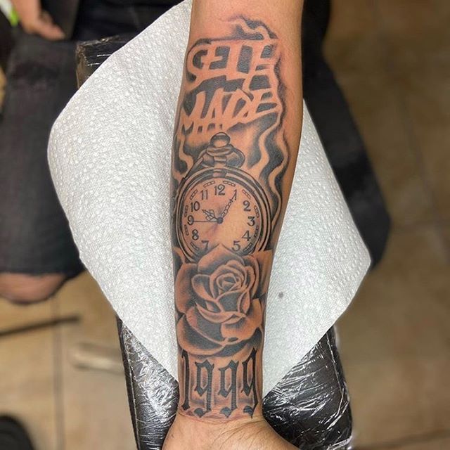 This tattoo gives “I’ve been through it, and I still look good doing it.” The mix of bold lettering up top, a classic pocket watch in the center, and that soft rose underneath is such a clean blend of tough and romantic. And adding a year at the wrist? That’s the little personal stamp that makes it feel like your story, not just a random design pulled off a wall.