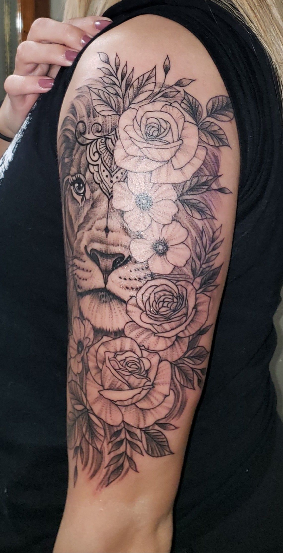 5. Lion and Roses Upper-Arm Quarter Sleeve