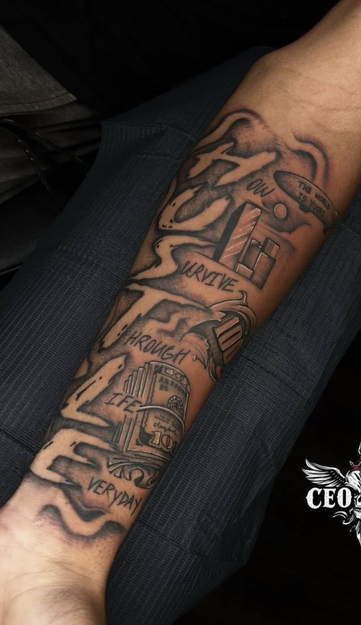 It feels like a whole life chapter written in ink—big, gritty, and weirdly inspiring. That big swirl of smoke-like shading, the statement lettering, and those little “life” details (the cash, the symbols, and the banner vibe) give it that late-night, keep-going push. It’s the type of piece that doesn’t require permission to exist; it just arrives, hogs room, and lets you know that you made it through all those things you didn’t think you could.