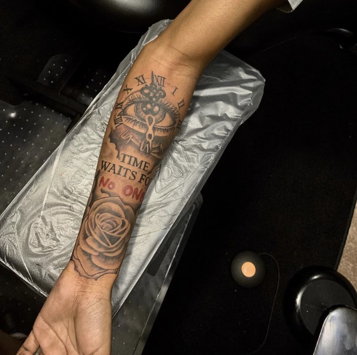This one is dramatic in a good way—the kind of not-a-reminder you can no longer “un-remember.” The eye matched with Roman numerals seems watchful and a little bit mystical, and the quote that travels down the forearm is essentially a pep talk with teeth. Then, the rose softens it just barely so it’s not a barrage of intensity, all intensity, all the time. It’s brash, but it hasn’t totally lost its soul.