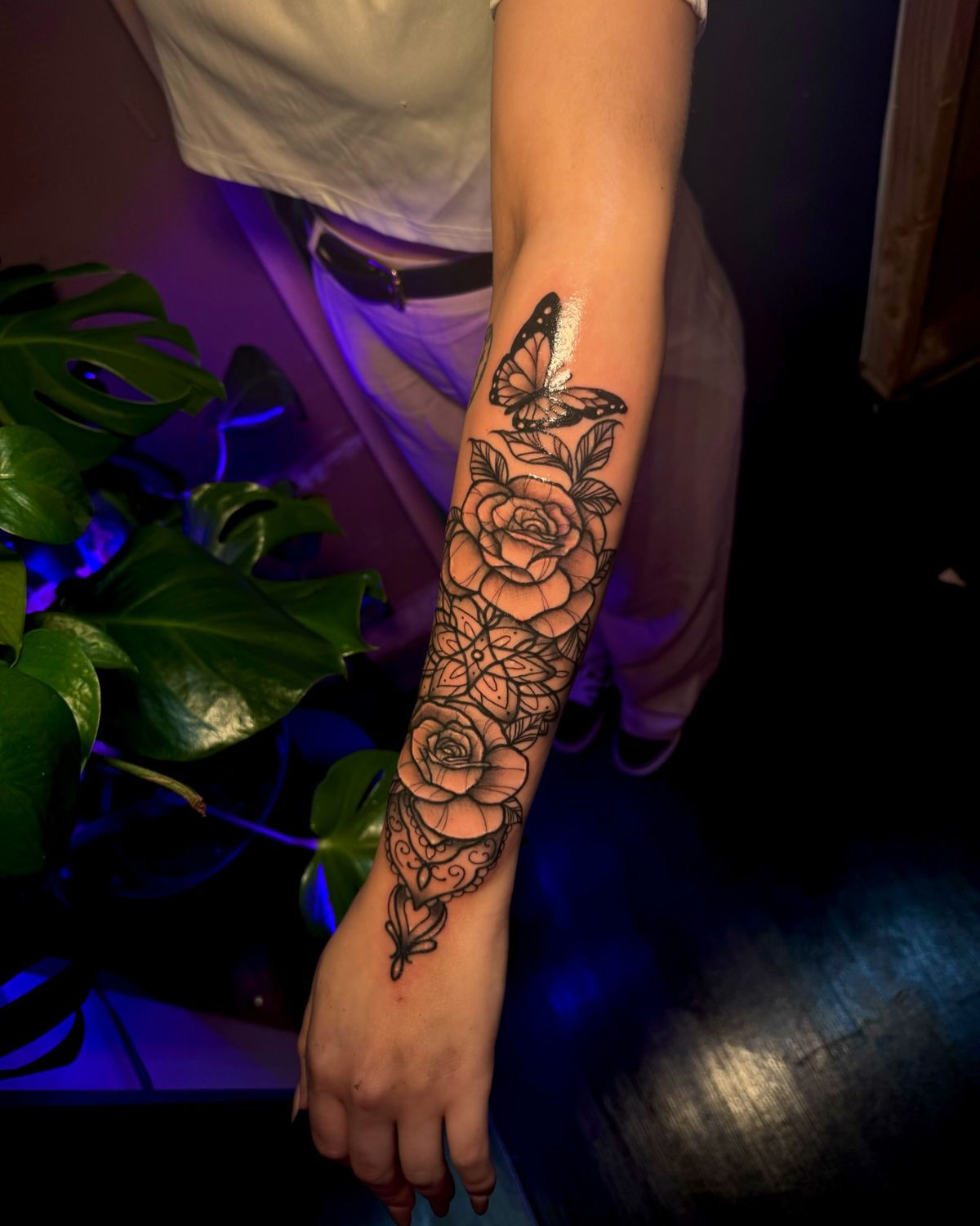 The specialness is in the color restraint: mostly black and gray with shots of red here and there, so that your eye goes right where it should. It’s a beautiful floral, perfect for women who desire that depth without going too dark. If you’re working on a women stencil sort of thing, leave the petals larger so they age coherently and put the butterflies where there is flatter “real estate” for cleaner edges—the flat of the arm, down toward the elbow.