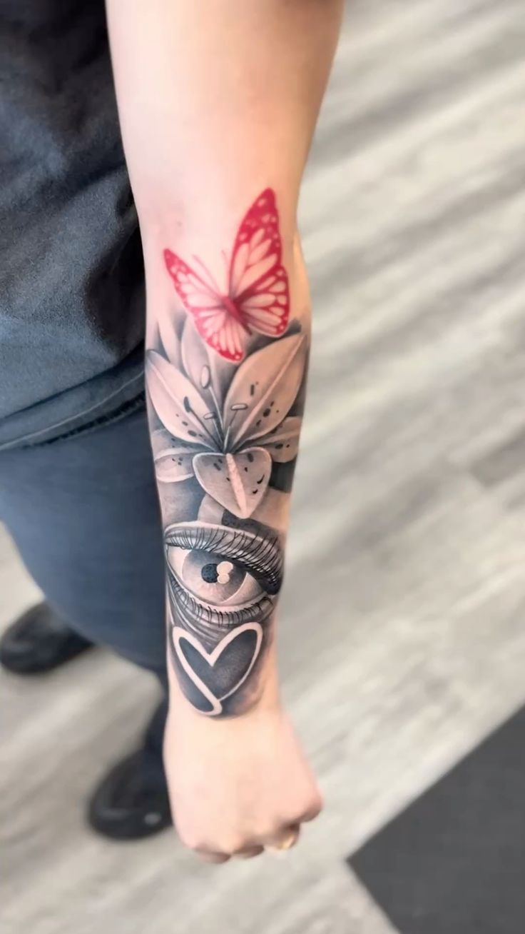 This tattoo is a whole vibe all wrapped up in one pretty little mashup: soft, observant, and just the smallest bit defiant. The lily’s graceful, the eye gives it that “I intuitively know what’s really going on” vibe, and the red butterfly is just like a little burst of courage right there at the top. It’s girly, but it isn’t here to be sweet—this is about leaving an impression.