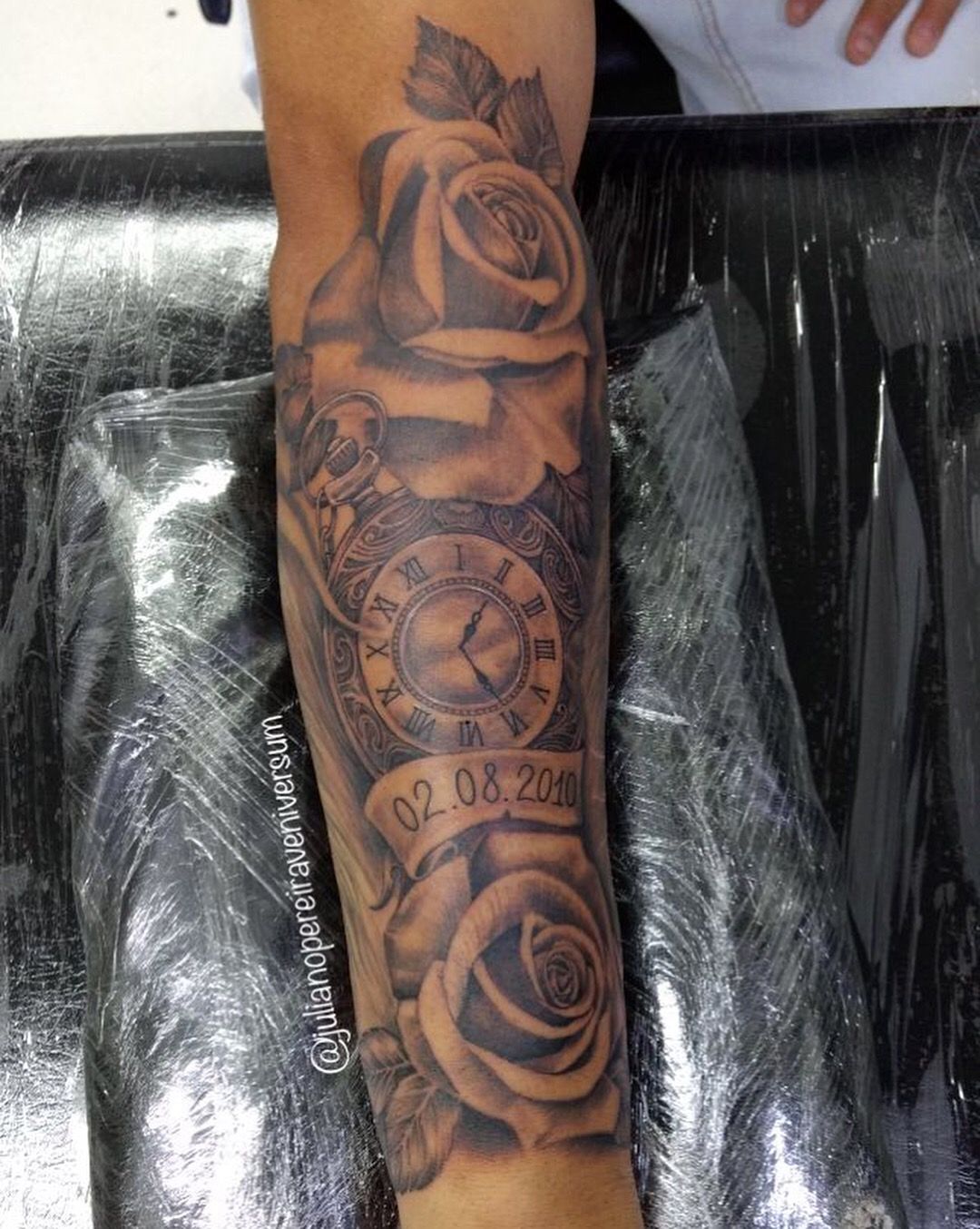 Who it’s for: if you love meaningful ink but want it to look polished, this is a great forearm layout for men—and honestly, it can be adapted for women too if you soften the typography. The rose helps it read less harsh and more balanced. Keep the watch face mid-forearm so it stays centered when your arm moves, and ask for smooth shading rather than heavy fill if you want it to age gracefully.