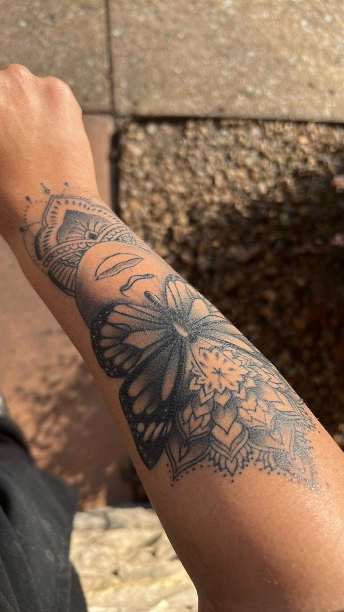 Those hybrid designs are all over the place in 2025 because they give you two styles in one: organic wing shapes combined with stencil geometry. It’s great for placement on a woman’s forearm because the wing can stretch out with the arm along its natural line, and the mandala reads like a statement bracelet. I would ask for smooth gradients in the wing and crisp dots in the mandala so that the contrast remains deliberate as it ages.