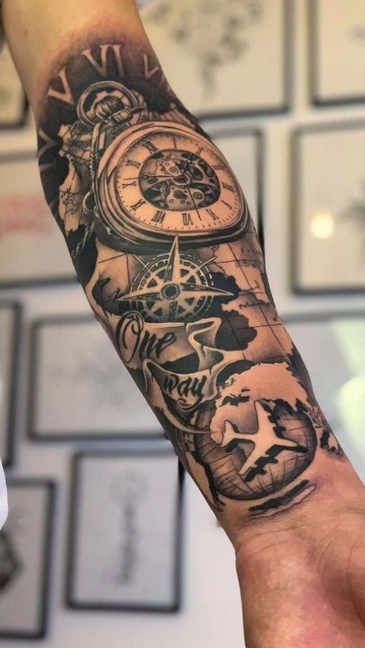 With the addition of another compass, it makes this design bigger and more layered, making for a powerful choice as tattoos for men in general. It’s best on a man’s forearm, since the length allows enough room for each symbol to shine without crowding. To prevent this from happening, request for the lighting to all be coming in from one direction on both the watch and compass so that they match realism-wise. If you want it to be a bit less busy, you can leave out the additional background shading and let the map textures take more of a back seat.