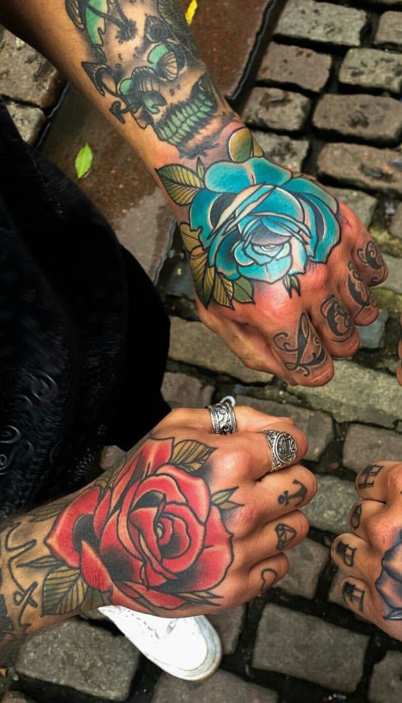 Two friends, two fists, and two attitudes—one Blue, one Red—make this pairing feel bold and celebratory. The clean outlines and leaf geometry keep everything punchy, like a poster you can wear. It’s playful without losing edge, and the color pop looks incredible in photos or under bar light. If you love classic motifs with a modern kick, this one’s a conversation magnet. What to wear it with: stack silver bands, a leather watch, or even a denim jacket to echo the palette. The Traditional lines hold up under daily life, so men and Woman who live hard can still look polished. Ask your artist for a design stencil outline that mirrors both hands for symmetry; drop in Money-green leaves to intensify the bloom.