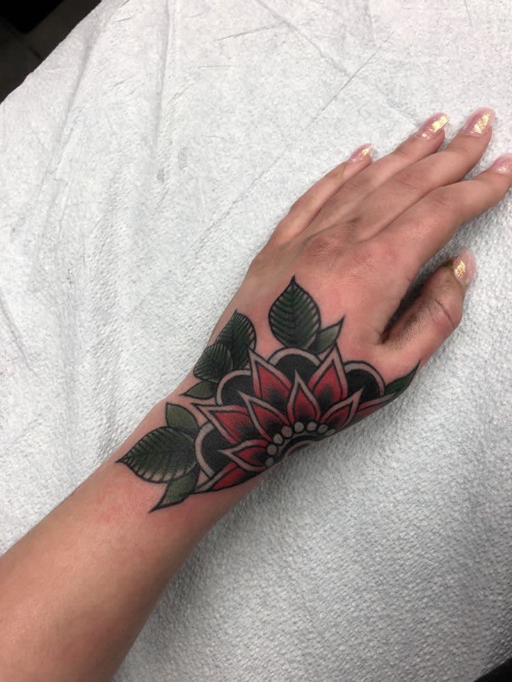 Hello, icon. This Red rose with dark leaves bridges the wrist and hand like a well-tailored cuff. The petals are plush, the shading old-school, and the outline confident—exactly what you want when you’re channeling timeless tattoo energy. It’s joyful, a little rebellious, and absolutely photogenic with long nails or a stack of bangles. Comparison with other styles: compared to soft black-and-grey, this Traditional colorway reads louder and ages differently—expect classic fade to a warm brick Red and forest Black-green leaves. If you want a subtler route, keep the palette monochrome; if you love drama, add a Blue shadow at the base to deepen the bloom.