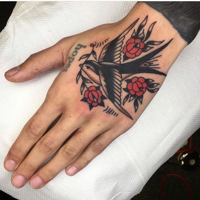 A swift swallow cuts across the hand, flanked by tiny Red roses—pure sailor romance with a modern clean-up. The movement is dynamic, the palette restrained, and the symbolism? Freedom, loyalty, safe returns. It’s crisp, storytelling ink that still looks sleek with a blazer and boots. Motivation to try it now: Traditional flash is trending again and artists are dialing in super-smooth Black fills that heal like satin. If you’ve ever wanted a classic, this is your moment. Ask for a design stencil vorlage to set wing angles perfectly; you can add Blue tips or a small Guys anchor later to personalize.