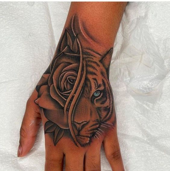 Power meets poetry: one half a calm, blue-eyed tiger, the other a lush rose unfurling in shadow. The seam between them is razor clean, turning your hand into a living diptych—strength and softness in equal measure. It’s an arresting, cinematic take that looks custom even from across the room, speaking to both men and Woman who like their symbols layered. What makes this design special or unique: the dual narrative. The feline’s gaze pulls focus while the petals soften the energy, and the shared Black base keeps everything cohesive. Ask for a precise design stencil outline so the split tracks the tendons; it helps the illusion when you flex. Add subtle Blue glints in the eye later or a tiny Money star near the wrist to extend the story.