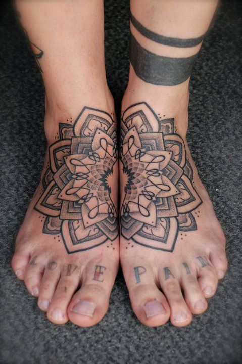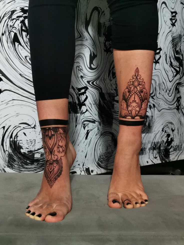 These matching mandala designs feel balanced, powerful, and incredibly intentional. They create a sense of harmony from calf to foot, almost like wearable architecture. The symmetry gives off calm confidence and a grounded, spiritual mood.