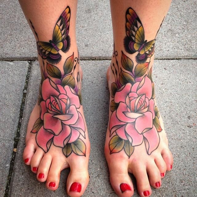 3. Butterfly and Floral Foot Tattoo with Soft Color