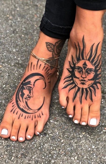 23. Sun and Moon Foot Tattoo With Mystical Balance