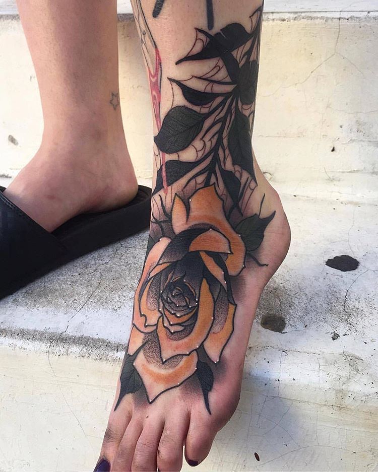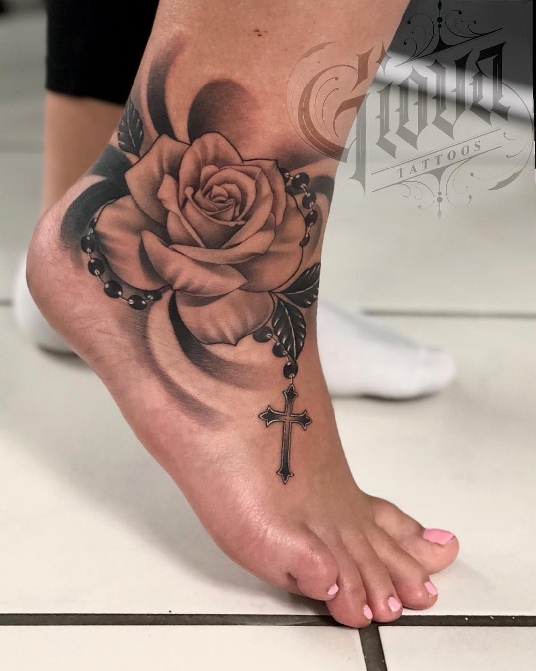 13. Bold Rose Foot Tattoo With Classic Beauty