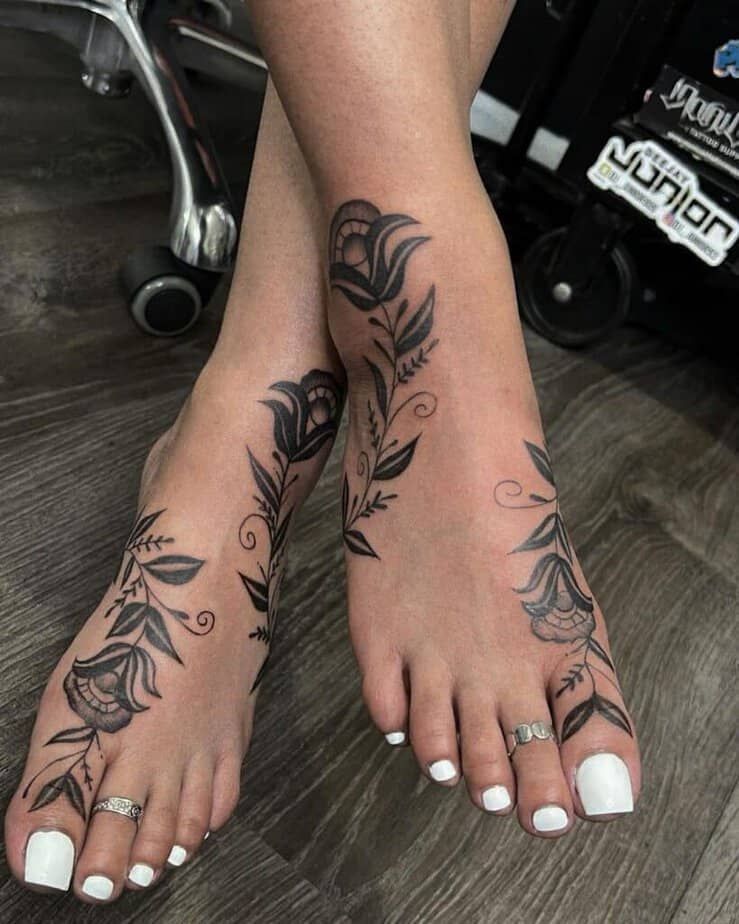 What makes this special is its balance. The designs work beautifully for women who want symmetry without being too matchy. They’re also ideal for someone easing into foot tattoos, since the lines are clean and adaptable. If you love floral but want something less traditional, this is a lovely middle ground.