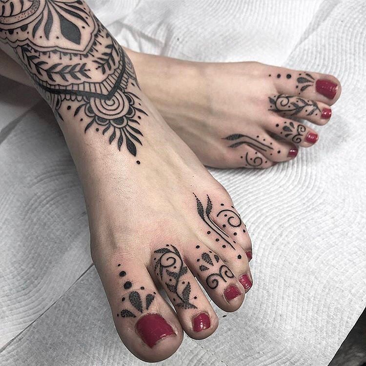 There’s something deeply grounding about this ornamental mandala-inspired foot tattoo. It feels intentional, almost meditative, like a quiet ritual you carry with you. The way the design flows naturally over the toes and across the top of the foot gives it a graceful confidence that doesn’t need to shout to be noticed. It’s decorative, yes, but also soulful—the kind of design that makes you feel put together even on barefoot days.
