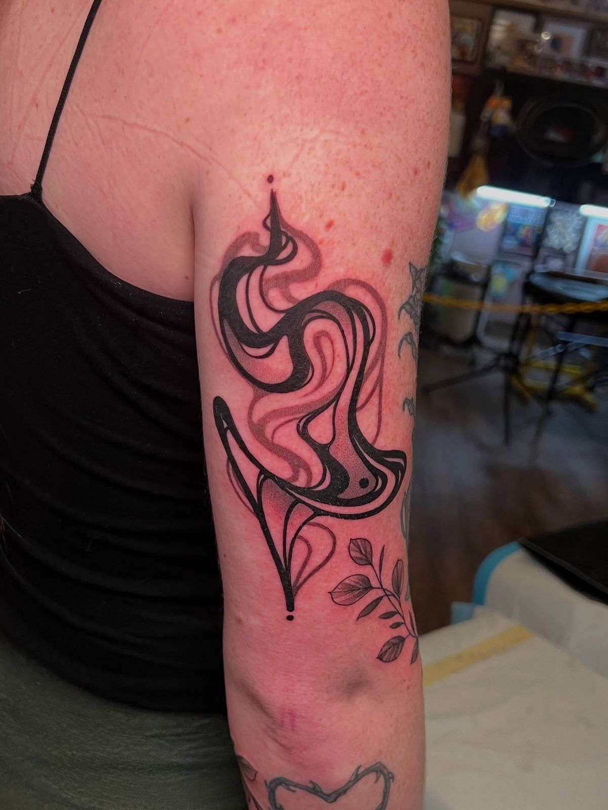 Low-maintenance bonus: designs like this don’t need a million tiny details to look amazing. Keep the main black shapes clean and slightly thicker so they hold up, and treat the red background like an atmosphere—soft, blended, not patchy. It’s a great arm placement if you want something that shows with sleeveless tops but still feels refined rather than loud.