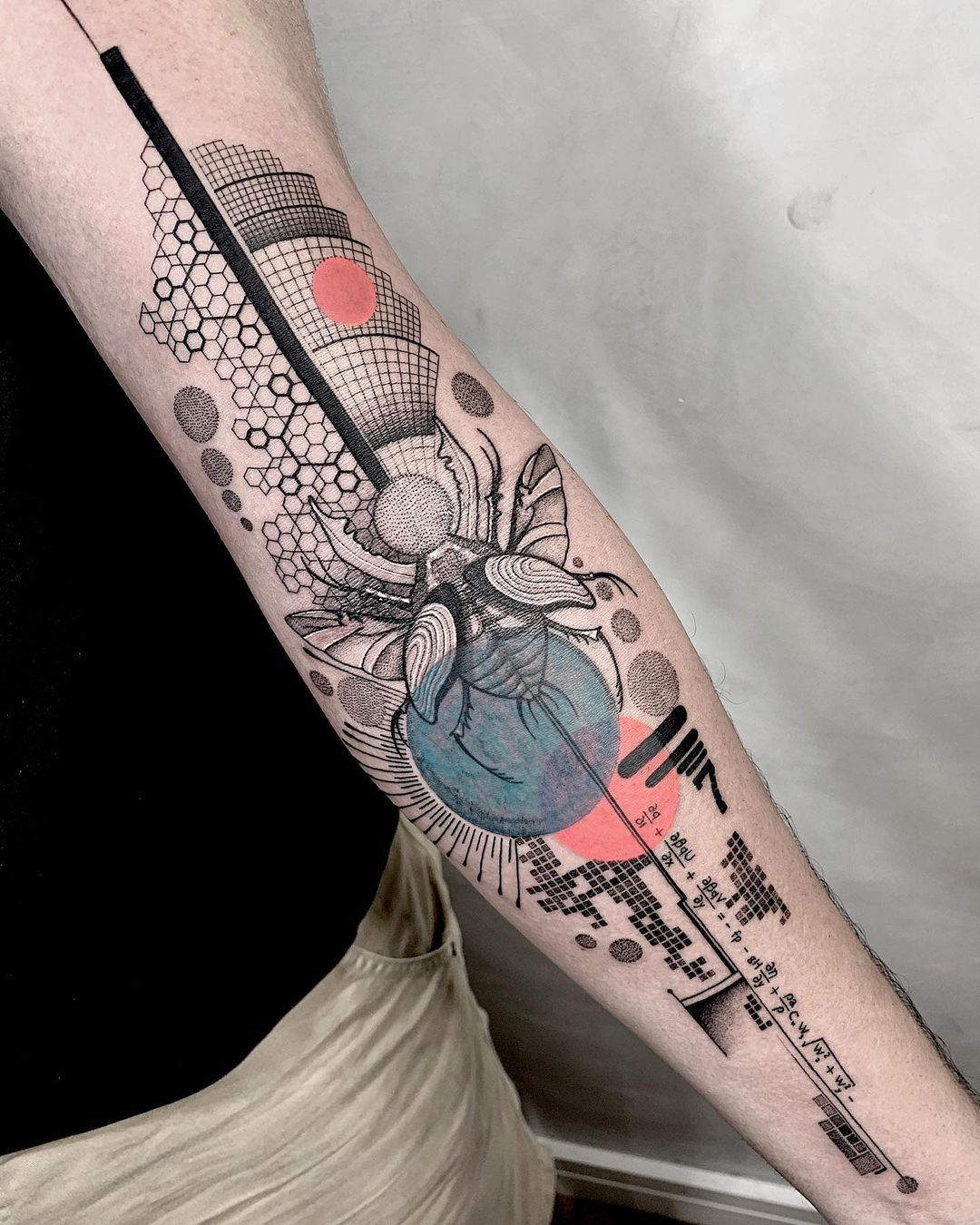 This is the tattoo equivalent of smart-casual style: structured, artsy, and quietly confident. The bee feels symbolic without being overly literal, and the mix of grids, dots, and circles keeps it feeling abstract and modern. That tiny red accent is like a perfectly chosen lipstick—small detail, big impact.
