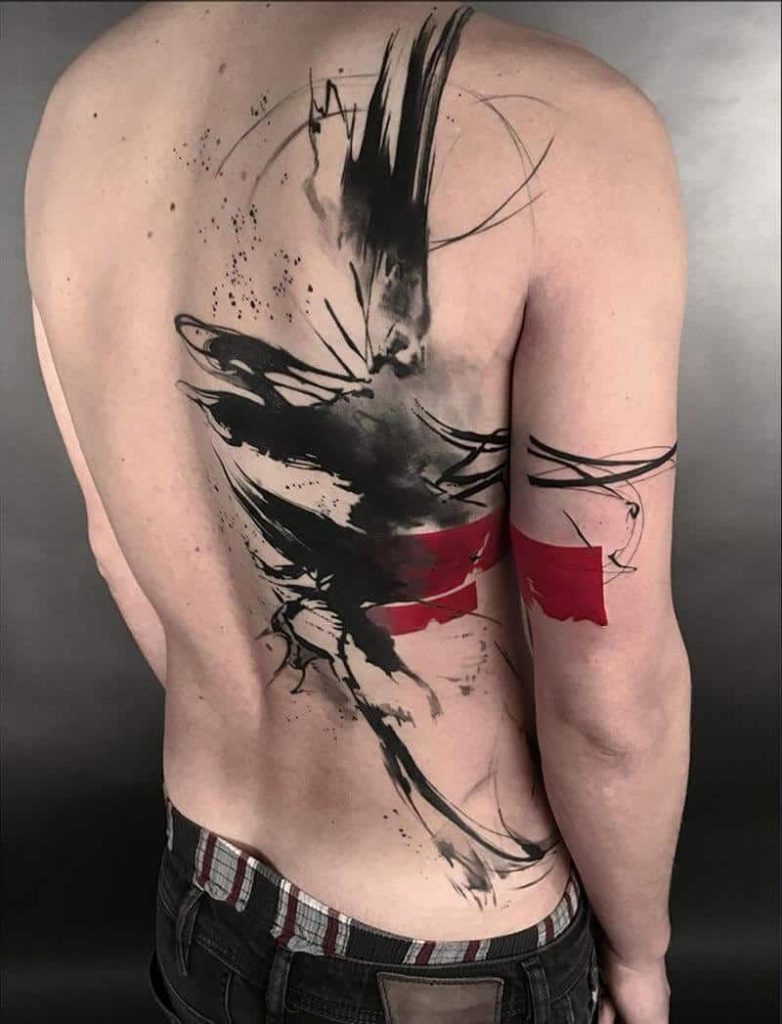 26. Abstract Brushstroke Back Tattoo With Red Accent